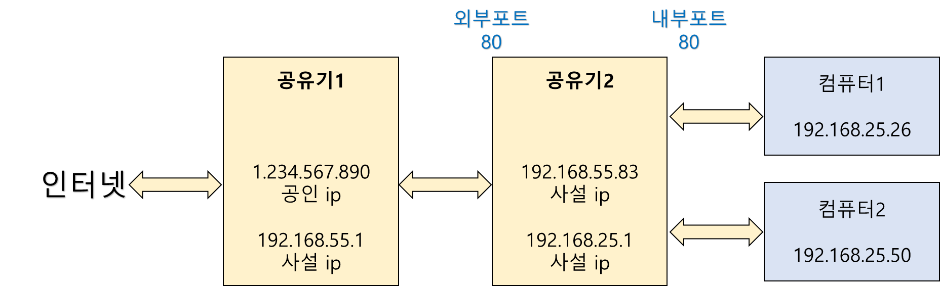 하지만 이전글에서도 언급되었듯이 인터넷<->공유기1 사이에 방화벽이 있기 때문에 방화벽 사이로 지나갈 포트를 하나 지정해줘야 한다.